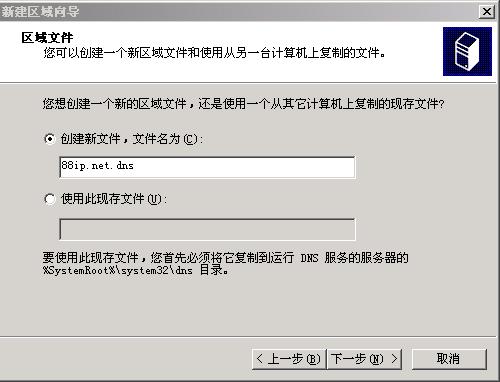 (3)随后系统会询问“区域名”,则在“名称”后的文字框中输入“88ip.net”;接着向导进入到“区域文件”提示窗口中,默认的,系统会自动选中“创建新文件,文件名为”一项,并在其后的文字框中自动填有“88ip.net.dns”(“88ip.net”部分即为上步所输入的“区域名”)的名字。
