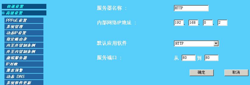 首先在”默认应用软件“下拉菜单里面选择”HTTP“,此时系统会自动把“服务器名称“添加为”HTTP“,然后将”内部网络ip地址“设为192.168.0.2,服务端口两个都填80。之后确定就可以了。