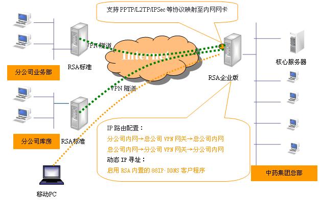 首先在公司总部和库房分别组建局域网络。总部网络包括K3应用服务器一台(提供数据及业务逻辑服务)、上网服务器一台(提供WEB服务、VPN服务、上网服务)、及桌面应用客户端。在上网服务器安装ADSL拨号软件、88IP客户端软件、安装RSA防火墙、并配置VPN与WEB服务。在库房组建局域网,配置一台上网服务器,安装上ADSL软件及网络安全加速服务器。 五、应用效果