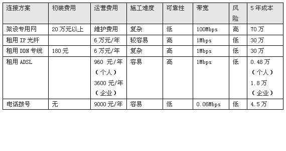 通过上表中几类连接方式的性能指标的综合评比,我们可以发现采用1Mbps的ADSL接入方式是最佳性价比的选择。