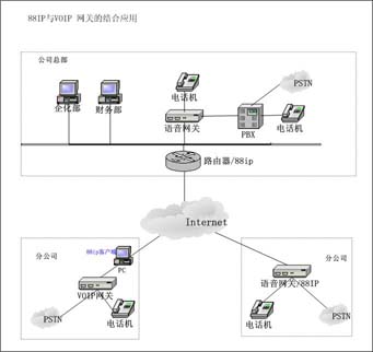 1)在总部和分部安装集成了88ip的VOIP 语音网关。