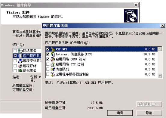 在控制面板的添加/删除程序—>Windows组件向导—>应用程序服务器—>选中“Asp.NET”,然后他就会自动把“Internet 信息服务(IIS)”的相关服务也装上。如下图: