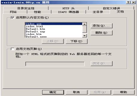 7. 设置自己的默认首页文档,选择< 网站 >--< casin-leuin.88ip.cn >,点击鼠标右键< 属性 >--< 文档 >,单击 < 添加 >按钮,添加您WEB首页名称,并使用< 上移 >按钮,将新加首页名称移至顶端。
