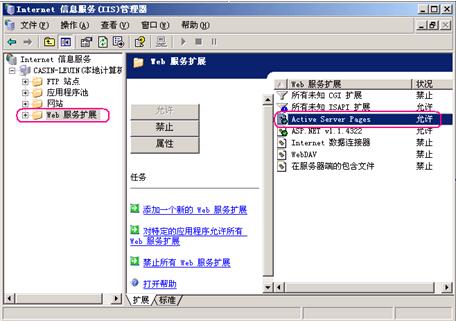 2、由于IIS 6比IIS 5多了一个WEB服务扩展控制,如果没有设置正确,ASP等……其他脚本网页也是无法正常显示的。双击Web服务扩展,然后在Active Server Pages(即ASP)上点击鼠标右键,选则< 允许 >。