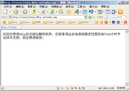 打开IE浏览器,在地址栏中输入http: //casin-leuin.88ip.cn进行测试。