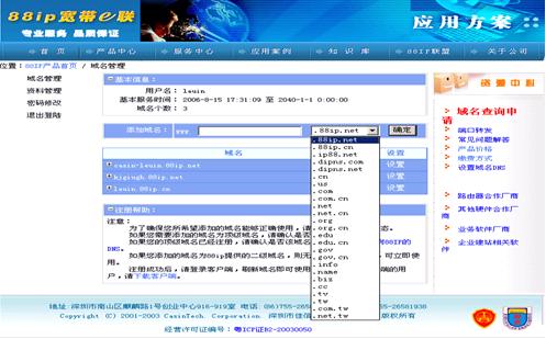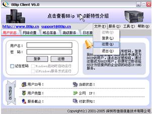 2.运行88ip软件,点击右首导航按钮中的“文件->注册”,继而链接官方网站的用户注册向导,按照向导详细填写用户信息后,进入“添加并管理我的域名”项,在“添加域名”栏申请一个免费域名作为互联网访问WEB服务的“网址”(内含五个免费的可供选择的二级域名后缀88ip.cn/88ip.net/ip88.net/dipns.com/dipns.net),点击“确定”,即时生效,该域名则已经加入到该用户下了。注册用户完成后,使用所注册的用户名称和密码填入88ip软件中进行登陆。