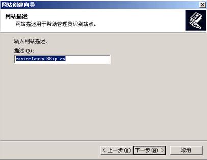 3、点击 < 下一步 > 以后,输入站点描述,只是在IIS里面的一个识别而已,不过为了自己方便识别,在这里我就输入网站访问的域名casin-leuin.88ip.cn,防止以后随着站点的增加而造成管理困难。确认以后点击 < 下一步 >。