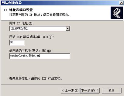 主机头:在这里填入别人访问您网站的域名,如果有多个域名可以随后在站点属性里面进行修改。