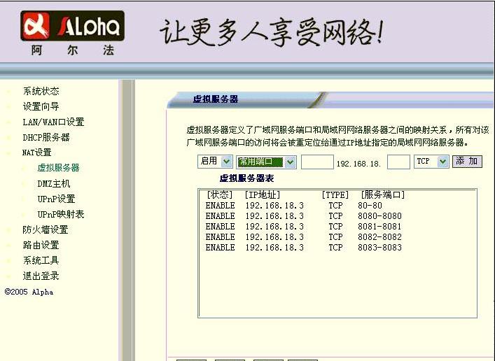 以架设web server为例:路由器上网关ip是192.168.18.1,web server的内网ip地址为192.168.18.3; 1、首先用IE浏览器登陆到路由器的web管理界面; 2、点击左边< NAT设置 >,在展开的下拉菜单里面点击< 虚拟服务器 >; 3、< 启用 >-< 常用端口处填80 >-< ip地址填写192.168.18.3 >-< 协议为TCP >; 4、点击< 添加 >,然后页面下面的< 保存 >之后就可以了。 具体情况请参照下图(图中做了80、8080、8081、8082、8083五个端口的转发):