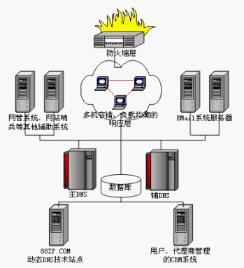 88IP在至少两家IDC机房构造了以上系统。为了避免IDC故障致使整个系统无法运行,88IP对系统进行了备份。当所托管的一家IDC出现故障时,另一家IDC机房中的系统可以提供相同的服务。