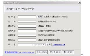 3.正确填写注册信息,其中“域名”一栏选择提供的六个二级域名(88ip.cn/88ip.com/88ip.net/ip88.net/dips.com/dipns.net),如88ip.cn。可以在几十秒后立即生效,而且不需任何费用。在空白处填写注册名,如:yourname,那你注册的域名就是yourname.88ip.cn.点击“下一步”继续填写相关信息。如下图: