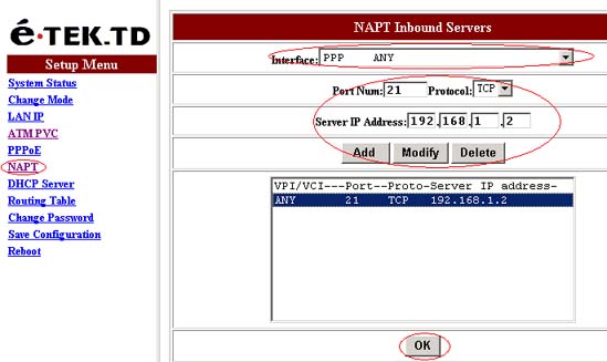 首先进入MODEM的WEB控制界面,进NAPT选项,选中“Interface”里的“PPP ANY” ,在“Port Num”里填入FTP的端口号“21”,“Protocol”里选“TCP”协议,“Server IP Address”填入FTPServer的IP:“192.168.1.2”点“Add”再点“OK”