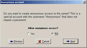 6)选择是否允许匿名访问,这里的示例选择的是“NO”,也就是用户需要用户名和密码才能访问FTP服务器,点击“Next”