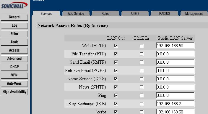 SonicWall防火墙端口转发流程如下: 以架设Web服务器为例,假设Web服务器的内网IP为192.168.0.50 首先登陆到防火墙,选择“Access",然后看默认的第一项“Services” ,在第一条“Web (HTTP)”后面的“LAN Out”里面打勾。然后在后面的“Public LAN Server”下面输入192.168.0.50,最后选择下面的“Update”就可以了。图片参考如下: